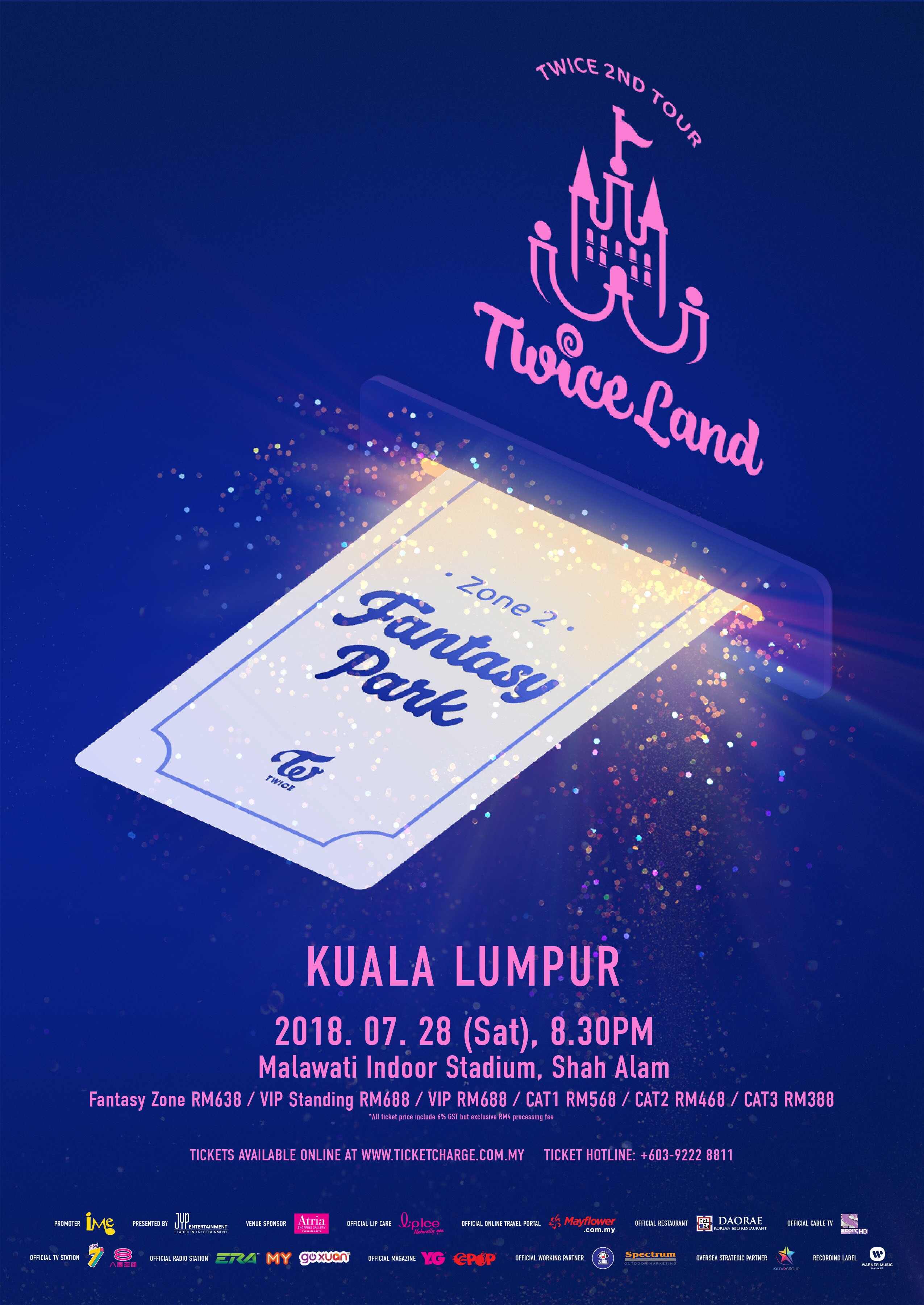 [CONCERT INFO] - TWICE 2ND TOUR 'TWICELAND ZONE 2 : 'Fantasy Park' IN KUALA LUMPUR - 2018.07.28 (SAT) 8:30PM (MYT) @ Malawati Indoor Stadium, Shah Alam [TICKET OPEN] - Pre Sales 2018.04.21(SAT) 11AM - 3PM (MYT) @ Atria Shopping Gallery - General Sales 2018.04.21(SAT) 9PM (MYT) @ Ticket Charge (www.ticketcharge.com.my) - More Info : https://www.facebook.com/imemalaysia